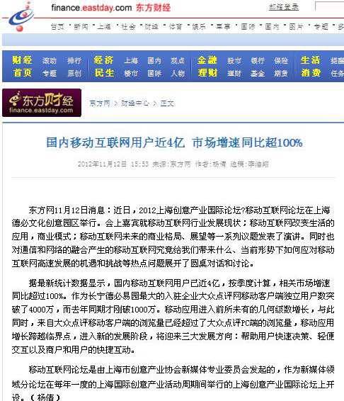 东方网:国内移动互联网用户近4亿 市场增速同比超100%