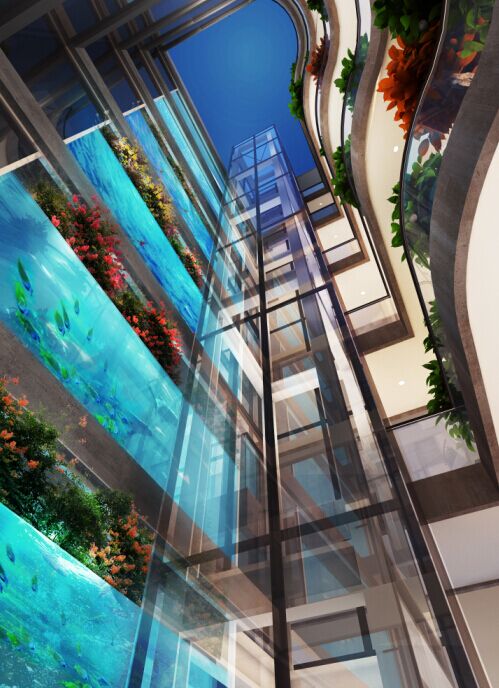 建筑将拥有上海最巨幅的垂直鱼缸,设计师强调水对于建筑的灵魂性作用,水将铁艺雕栏的浪漫欧洲风情与小桥流水质朴的东方气质完美的融合在一起,贯穿静安WE,构筑建筑的生命力。设计师带着对静安生活的新体验,为每户企业都设置了入户花园,从此在静安WE工作的白领,每天工作前,将会先经过清新自然的花园美景。