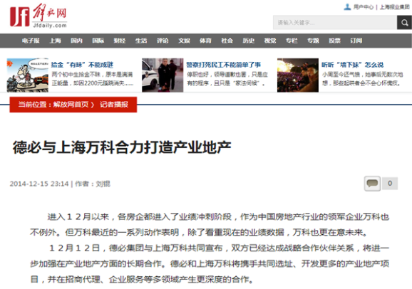 《解放网》:金沙澳门(中国)唯一官方网站与上海万科合力打造产业地产