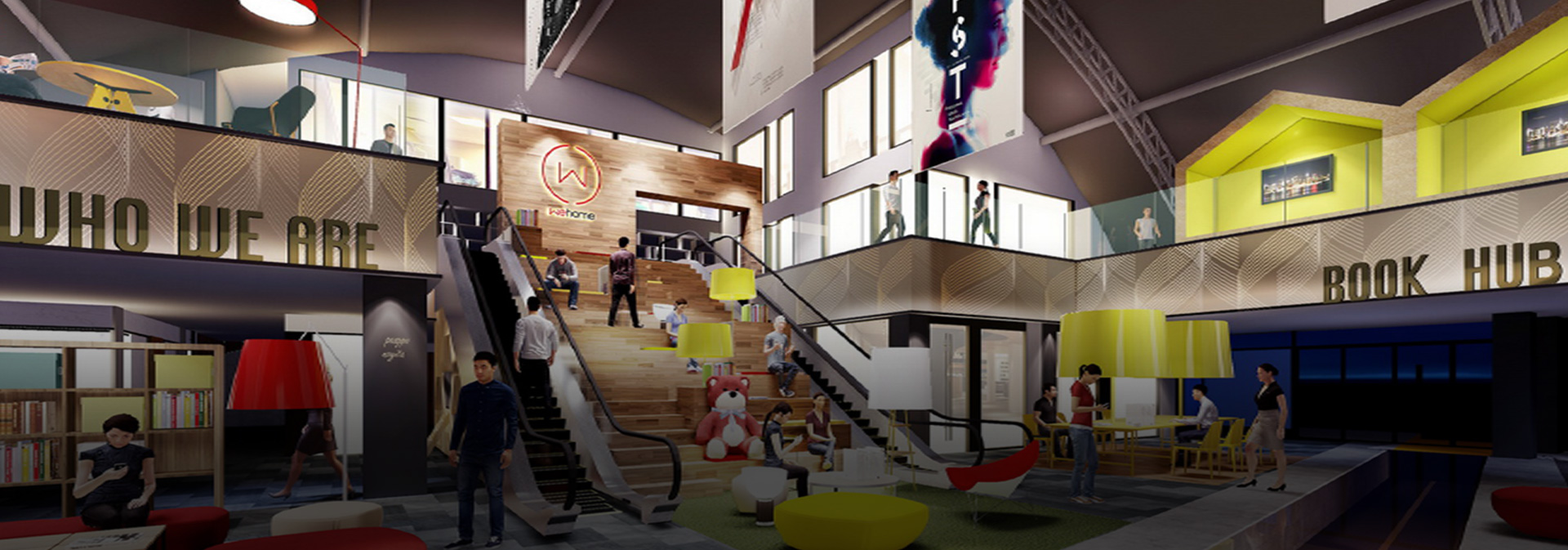 WE''认为,对办公项目来说建筑只是载体,人才是真正的核心。因而WE''以更开放交融的大社群理念取代个体办公的孤立性,强调人与人之间的沟通和互动。开放式社群社区中心wehome涵盖咖啡吧、书吧、自由餐厅、微影院、游艺区等多功能,在工作之余找到更多生活乐趣。国际交流中心、活动中心定期举办展会、论坛、艺术展、培训等活动,多方跨界资源联动,给企业和员工打造一个宽广的成长平台。