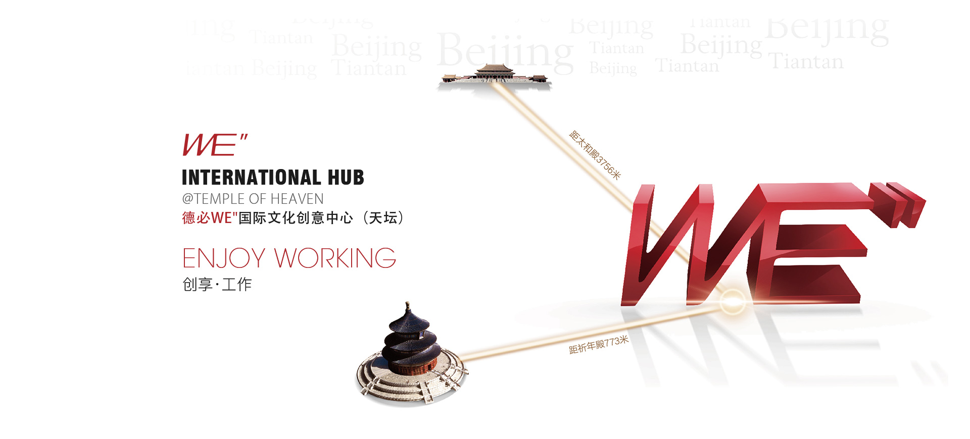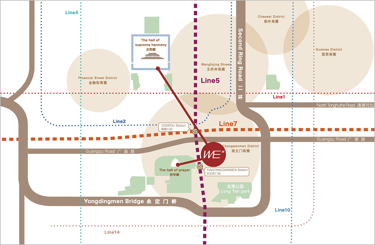 北京天坛,3000年帝都历史的见证者,巍巍皇城下的古老文明与新时代的国际思潮在此澎湃交汇。天坛WE''坐落于东城区天坛旁,比邻紫禁城,引连祈年殿与太和殿的气脉能量,集萃京城的城市芯文化精髓,是二环内稀少的规模型创意园区,地段价值不可复制。