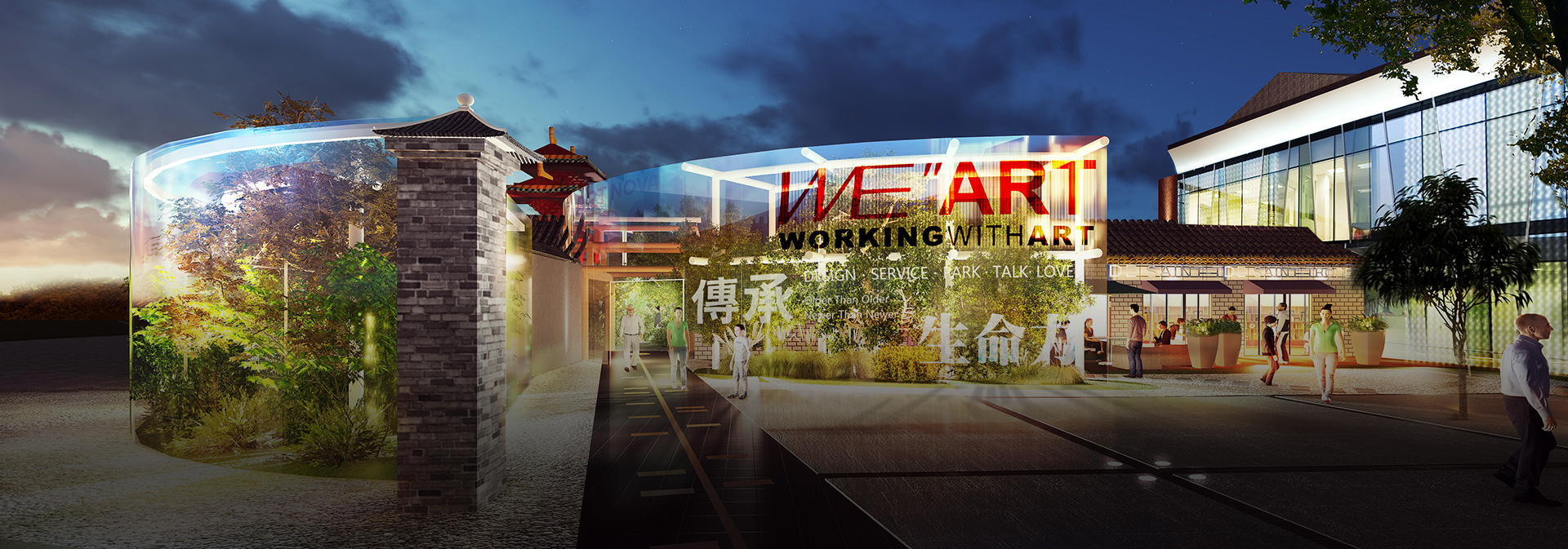 来自祈年殿和太和殿的射线在此交汇成园区人行景观中轴,既汇聚了千年历史文化能量,更连接各处景观、庭院和中心wehome,使整个园区成为文化、自然、艺术、人文共享的生命体。